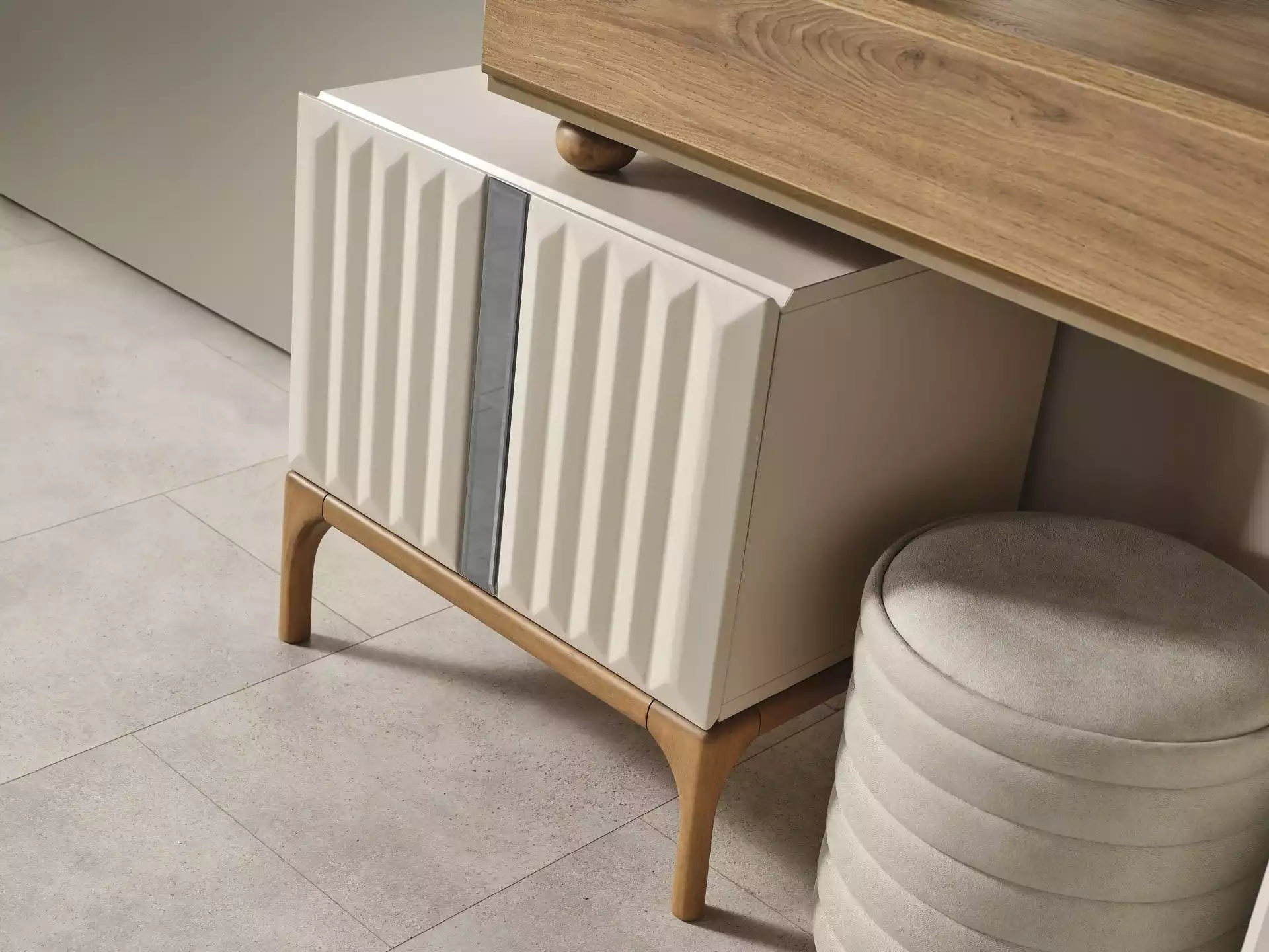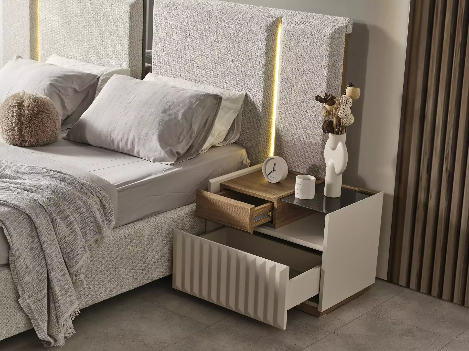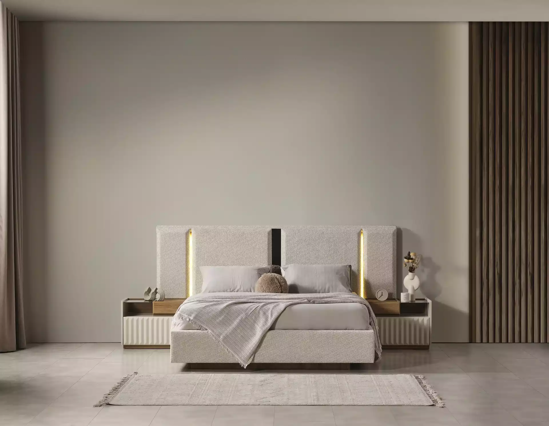 Alfa Yatak Odası Takımı, modern tasarımın sıcak ahşap dokunuşlarıyla buluştuğu lüks bir estetik sunar. Koleksiyonun karakteri, doğal ceviz/ahşap görünümlü gövde ile krem/bej tonlarındaki lake boyalı yüzeyler arasındaki sofistike kontrast üzerine kuruludur. Bu modern görünüm, modüllerde kullanılan zarif CNC desenler (dikey fitiller) ile zenginleştirilmiştir.