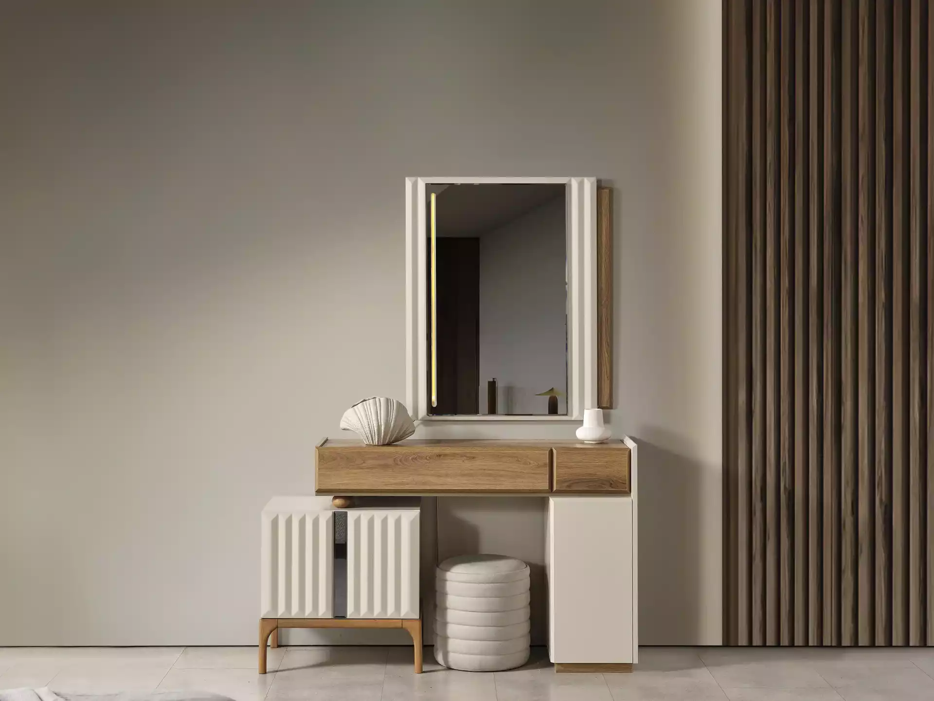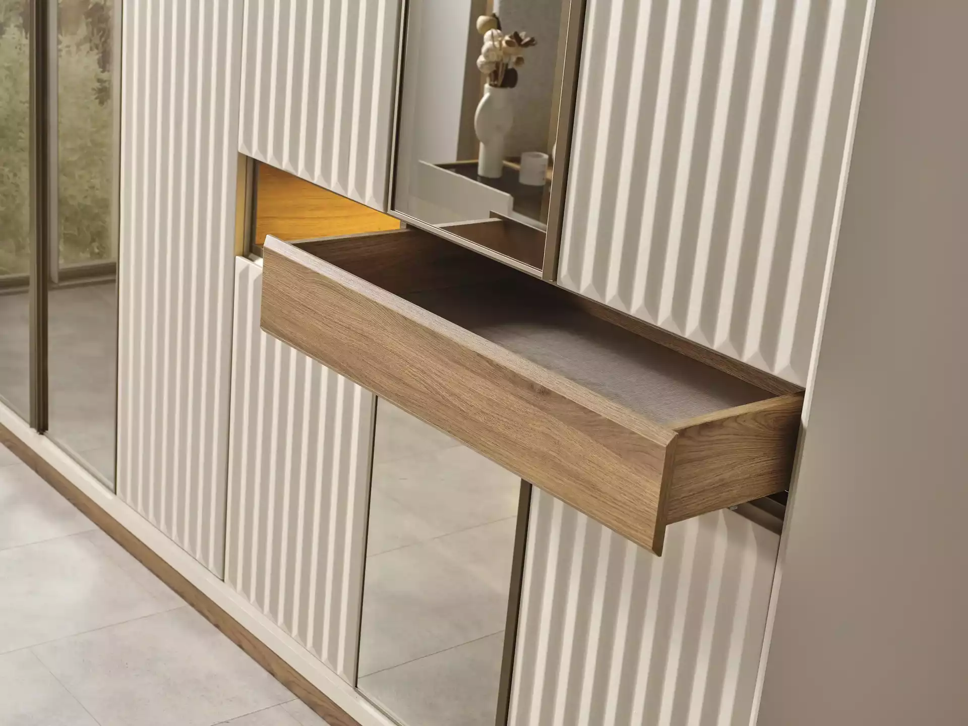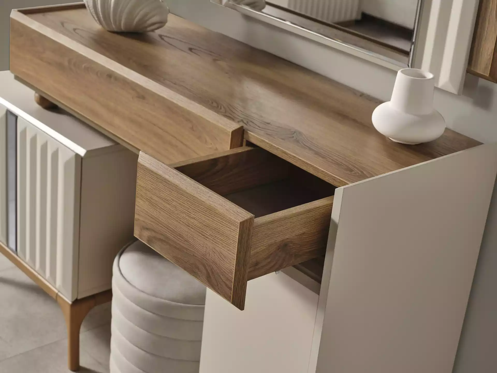 Alfa Yatak Odası Takımı, modern tasarımın sıcak ahşap dokunuşlarıyla buluştuğu lüks bir estetik sunar. Koleksiyonun karakteri, doğal ceviz/ahşap görünümlü gövde ile krem/bej tonlarındaki lake boyalı yüzeyler arasındaki sofistike kontrast üzerine kuruludur. Bu modern görünüm, modüllerde kullanılan zarif CNC desenler (dikey fitiller) ile zenginleştirilmiştir.