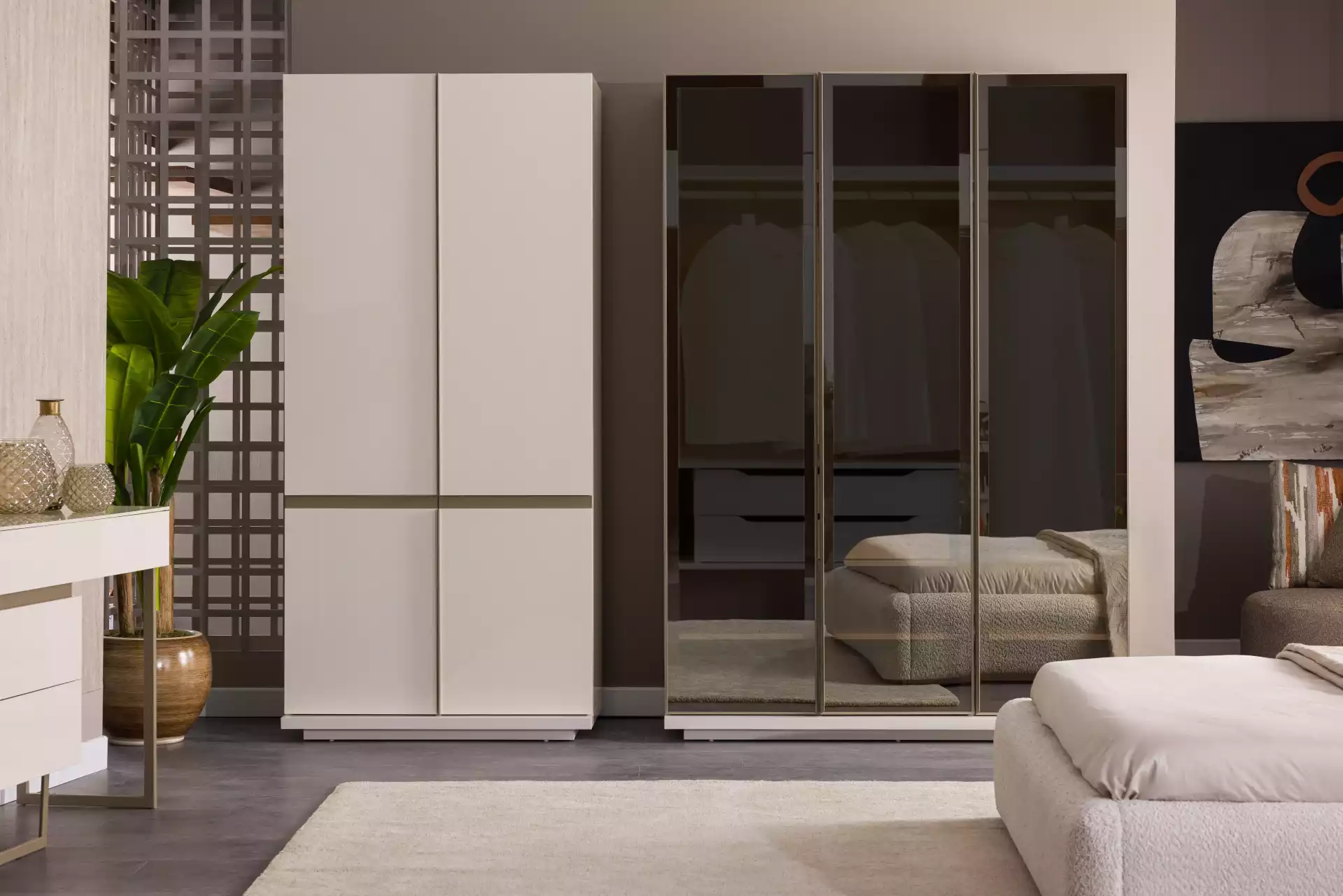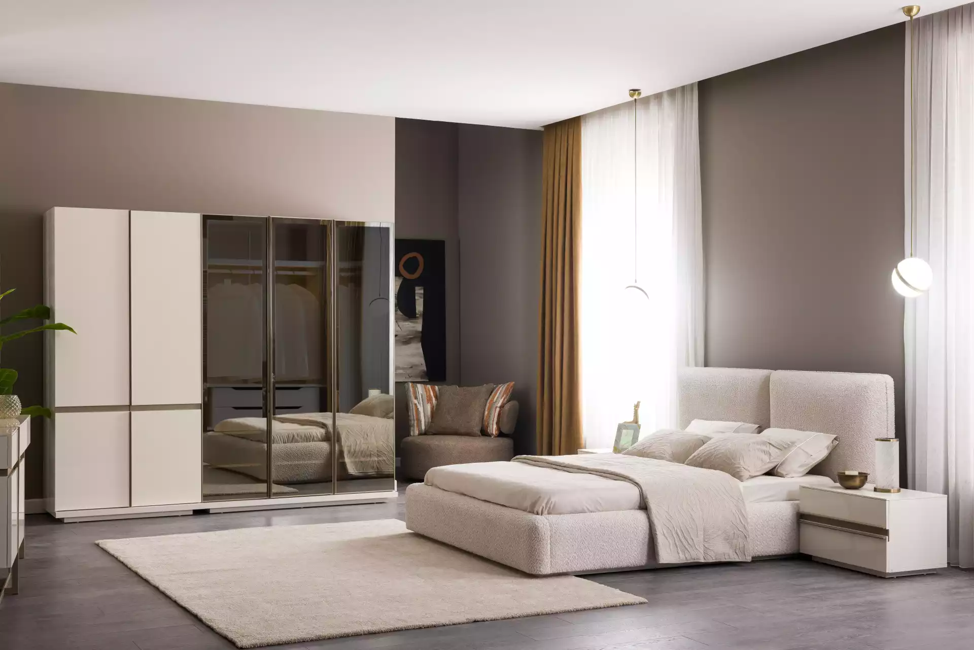 Avrupa standartlarında Yonga Levha malzeme ile üretilen takım, estetik olduğu kadar dayanıklı bir yapı sunar. Başlıkta kullanılan yumuşak dokulu havlu kumaş, konforu ve lüks hissini artırır. Takım, 5 kapılı (veya opsiyonel 2/3 kapılı) gardırop seçenekleri sunar; reflekte camlı yüzeyleriyle mekana derinlik katarken, tüm kapak ve çekmecelerde bulunan stoperli (yavaş kapanır) mekanizma sayesinde sessiz ve konforlu bir kullanım sağlar. Takım, bazasız karyola fonksiyonuna sahiptir.