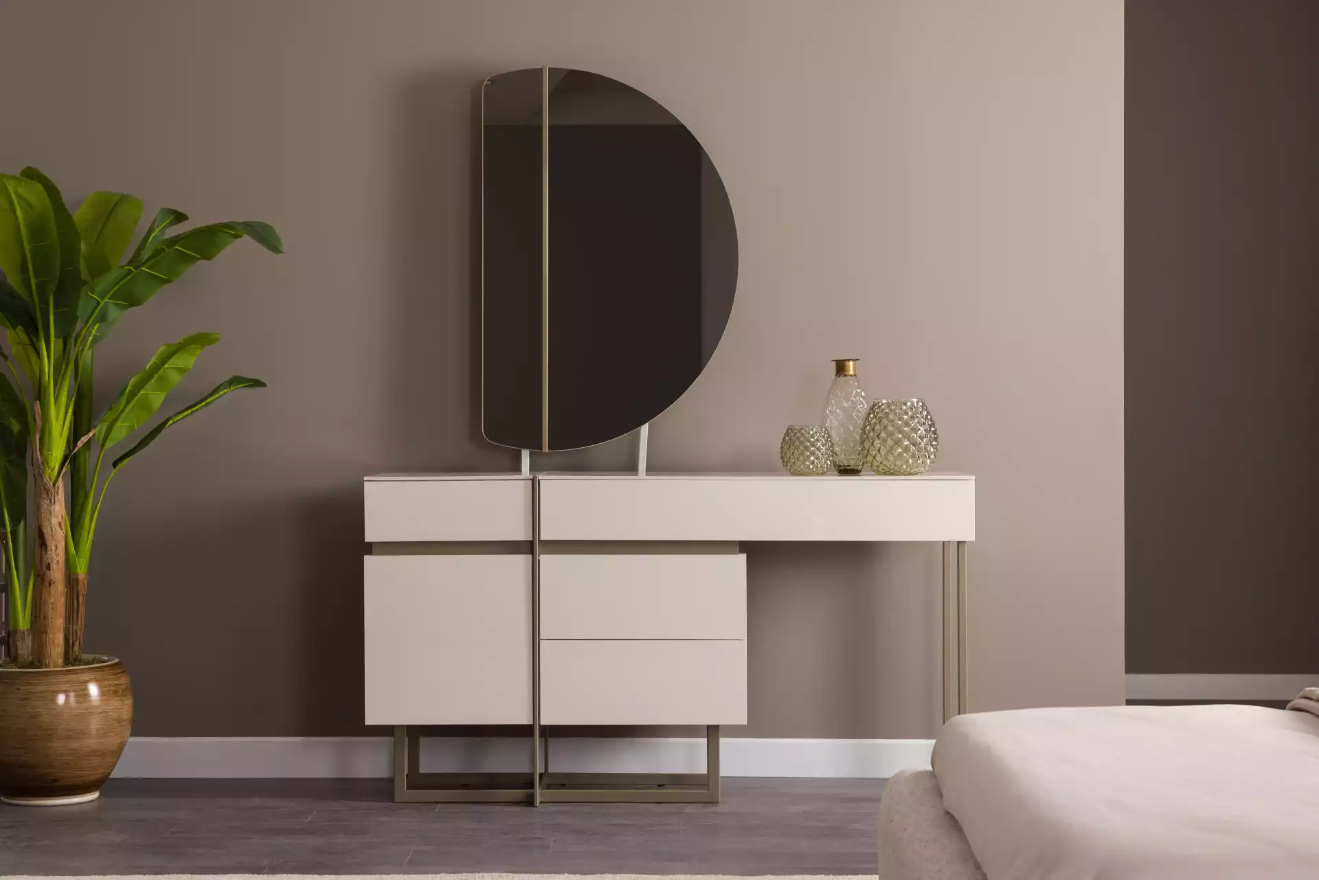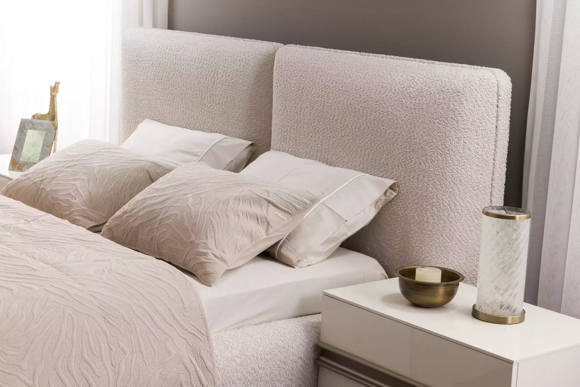 Blanca Yatak Odası Takımı, modern lüks anlayışını yumuşak ve zarif formlarla yeniden tanımlıyor. Odanıza sofistike bir dokunuş katan koleksiyonun imzası, yatak başlığından şifonyerine kadar tüm modüllerde kendini gösteren kavisli (oval) tasarım dilidir. Göz alıcı Krem renk paleti, parlak altın/gold tonlarındaki metal ayaklar ve zarif kulplarla mükemmel bir uyum yakalar.