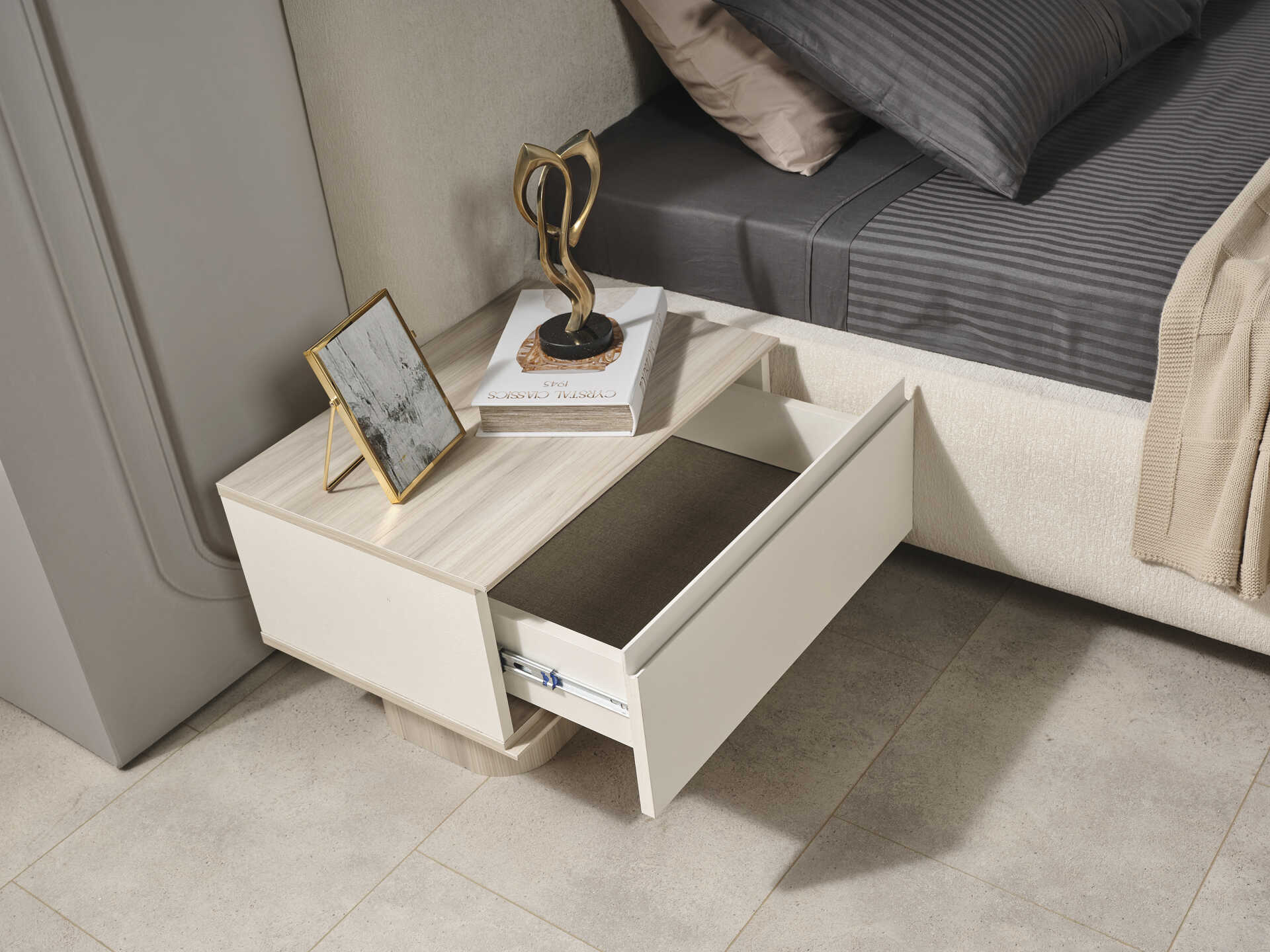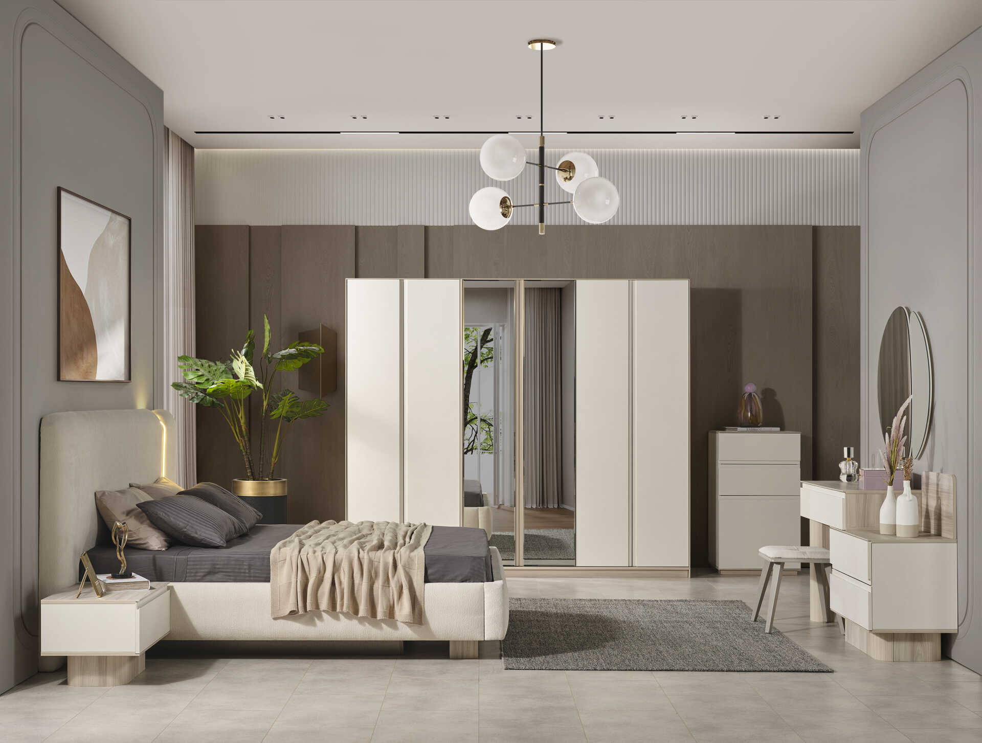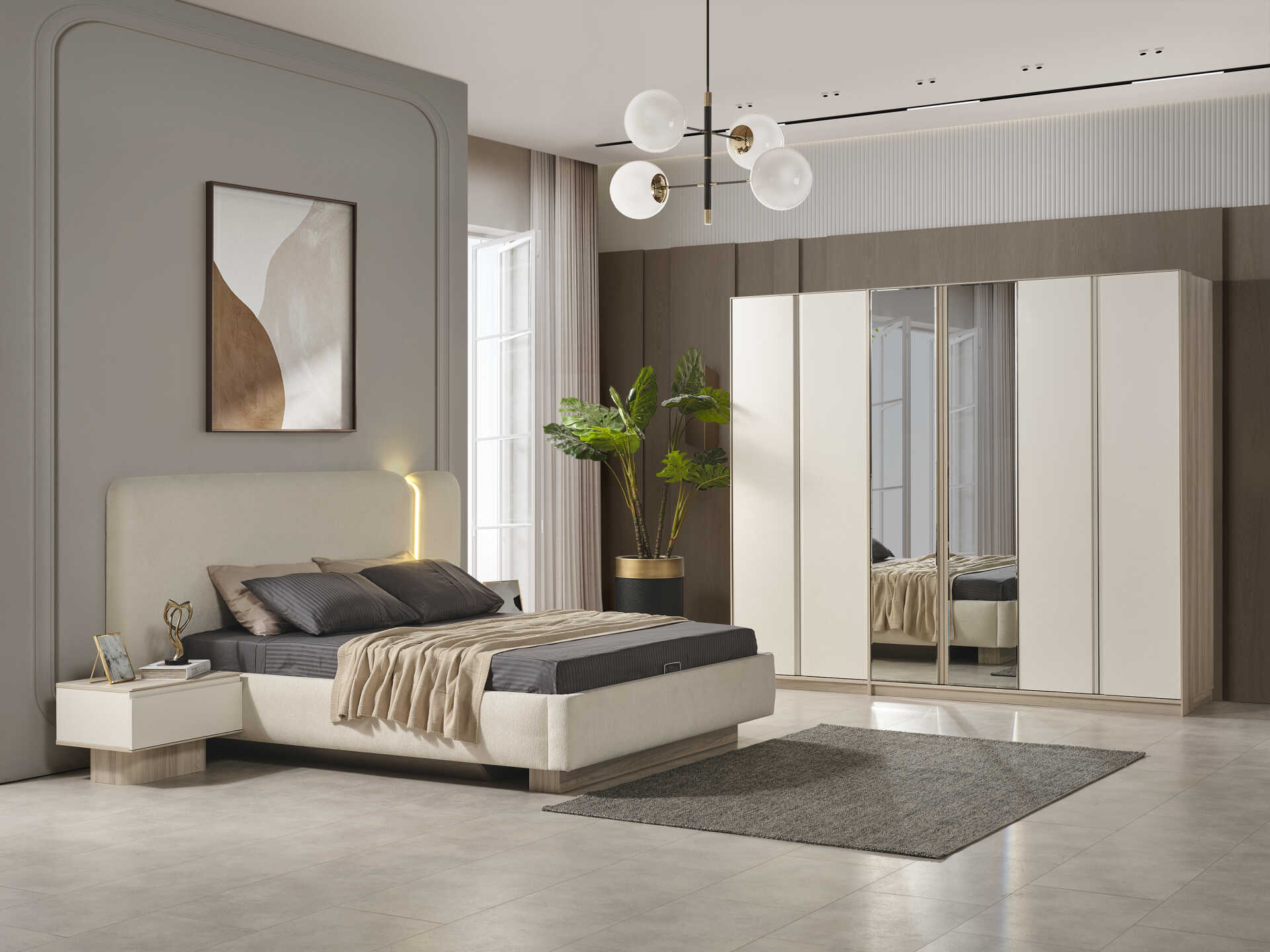 Tasarım, Avrupa E1 standartlarında Yonga Levha (Sunta Lam) malzeme kullanılarak üretilmiştir ve uzun ömürlü bir kullanım sunar. Takım, 6 kapaklı (4+2 modüler) yapısıyla geniş bir depolama çözümü sunar. Aynalı panellere sahip gardırop, yavaş kapanır (frenli) menteşe sistemleri ve teleskopik raylı çekmeceleri ile fonksiyonelliği zirveye taşır. Gri metal ayak detayları, takımın modern çizgisini şıklıkla tamamlar.