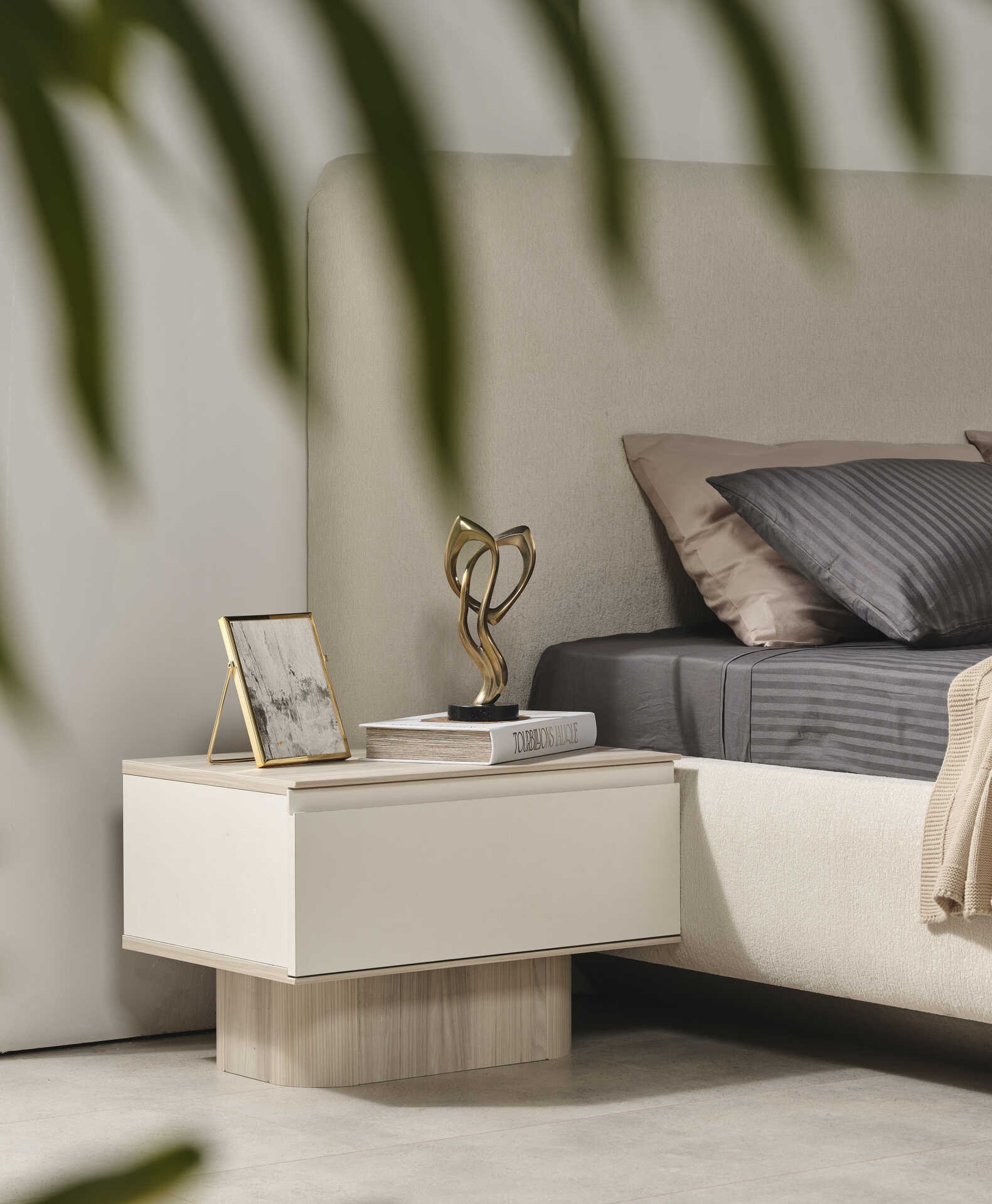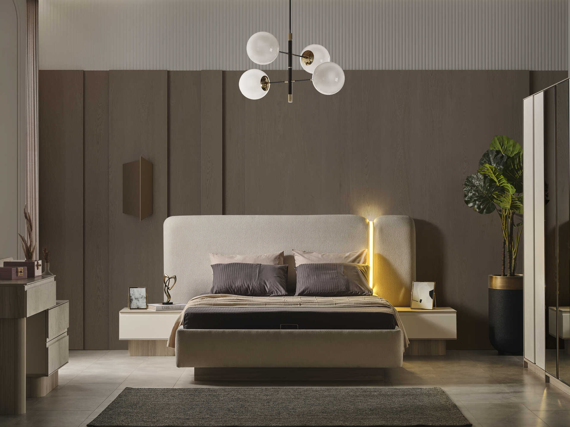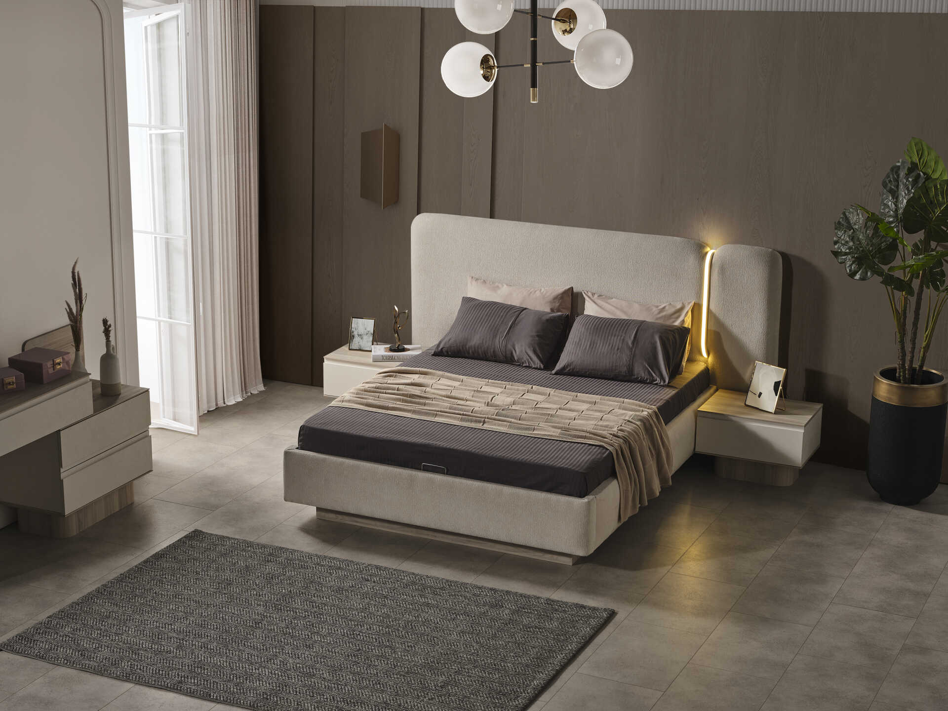 Adını tasarımındaki ışıltıdan alan Güneş Yatak Odası Takımı, modern ve minimalist bir estetiği yatak odanıza taşıyor. Göz alıcı parlak beyaz renk paleti, mekana ferahlık ve aydınlık bir derinlik katar. Koleksiyonun imza detayı, hem geniş yatak başlığında hem de şifonyer aynasında kullanılan zarif LED aydınlatma (aplik) sistemidir. Bu ışıltılı görünüm, yatak başlığında tercih edilen trend bukle kumaş dokusuyla birleşerek odanıza lüks ve sıcak bir atmosfer kazandırır.