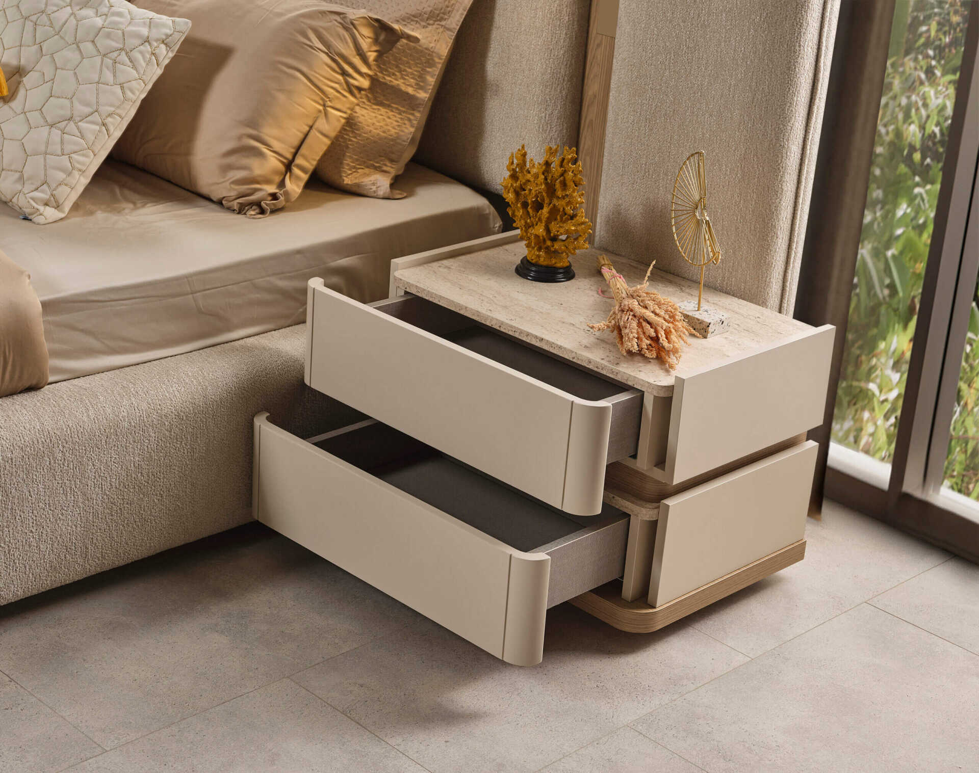 Lotus koleksiyonunun imzası, modüllerde kullanılan zarif kavisli (oval) formlardır. Bu oval tasarım dili; kumaş döşemeli yatak başlığında, şifonyer aynasında ve komodinlerde kendini gösterir. Tasarımın lüks algısını yükselten parlak altın/gold metal detaylar, yüksek ayak yapısında ve özel tasarım kulplarda kullanılmıştır. Takım, 5 kapılı geniş gardırobu, şık pufu ve fonksiyonel modülleriyle hem estetik hem de pratik bir çözüm sunar. Lotus, sade ve kaliteli yaşam tarzını sevenler için mükemmel bir seçimdir.
