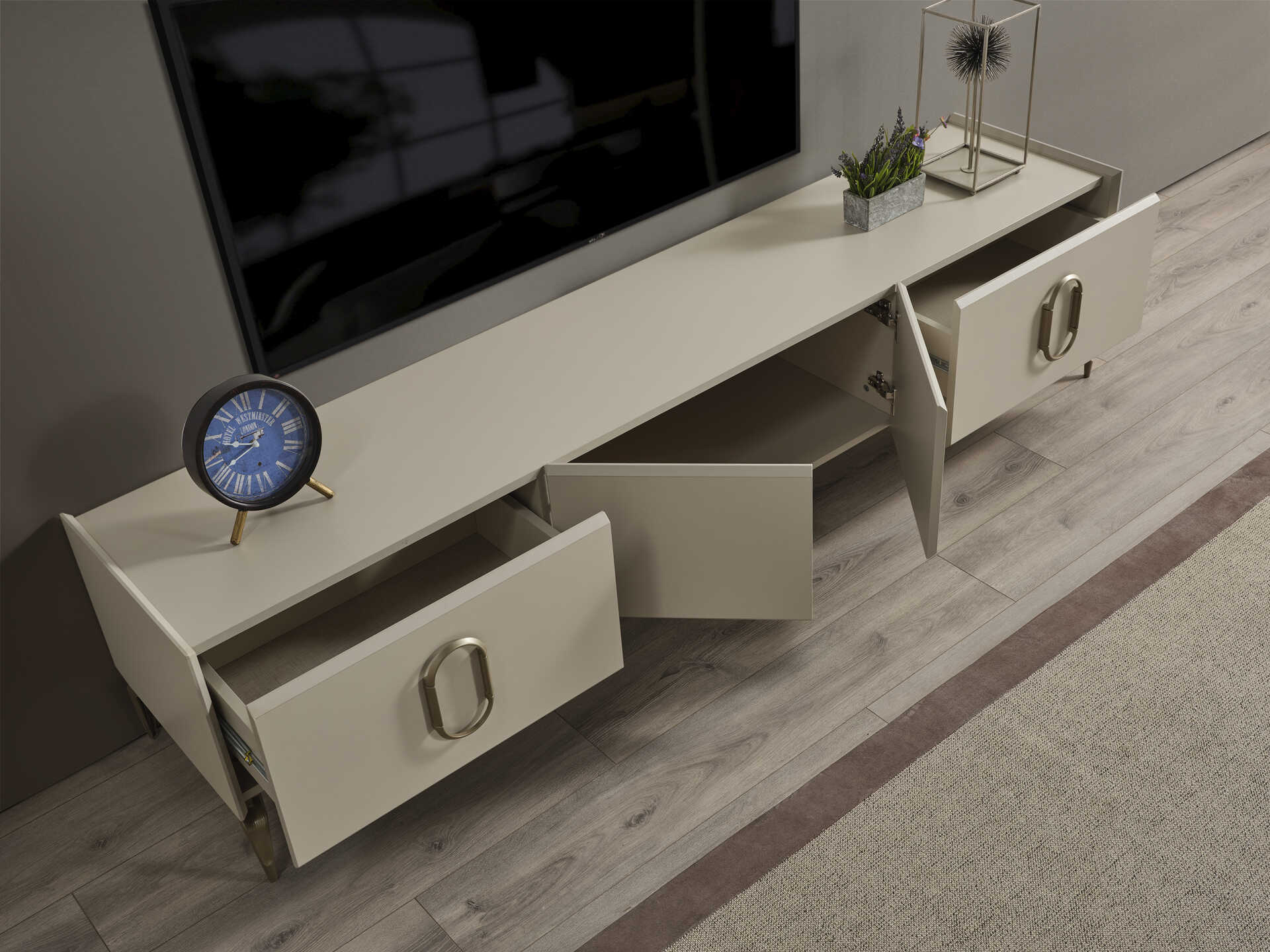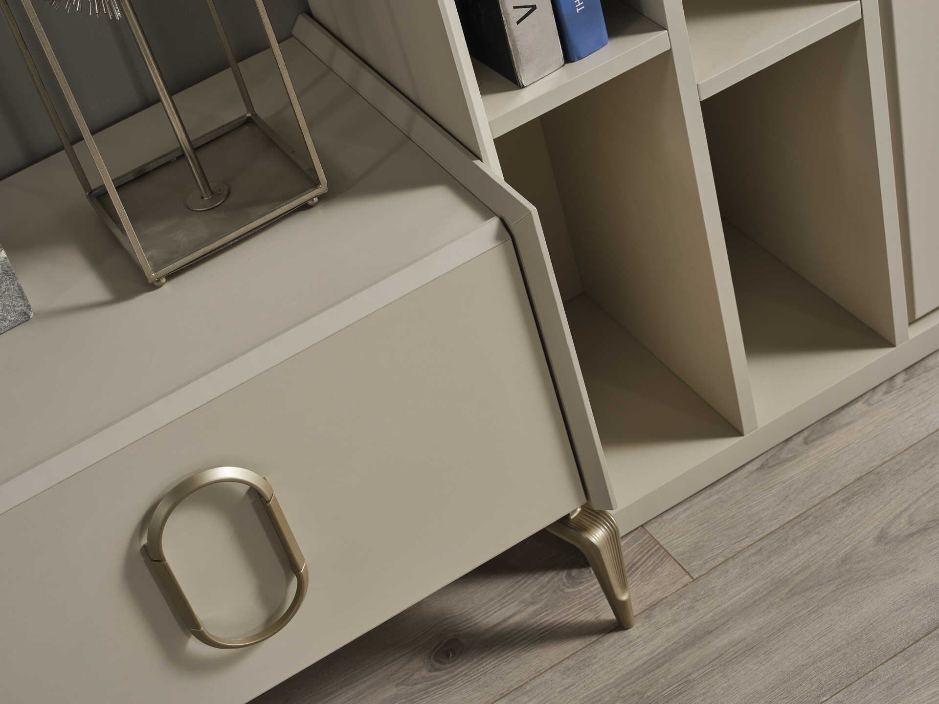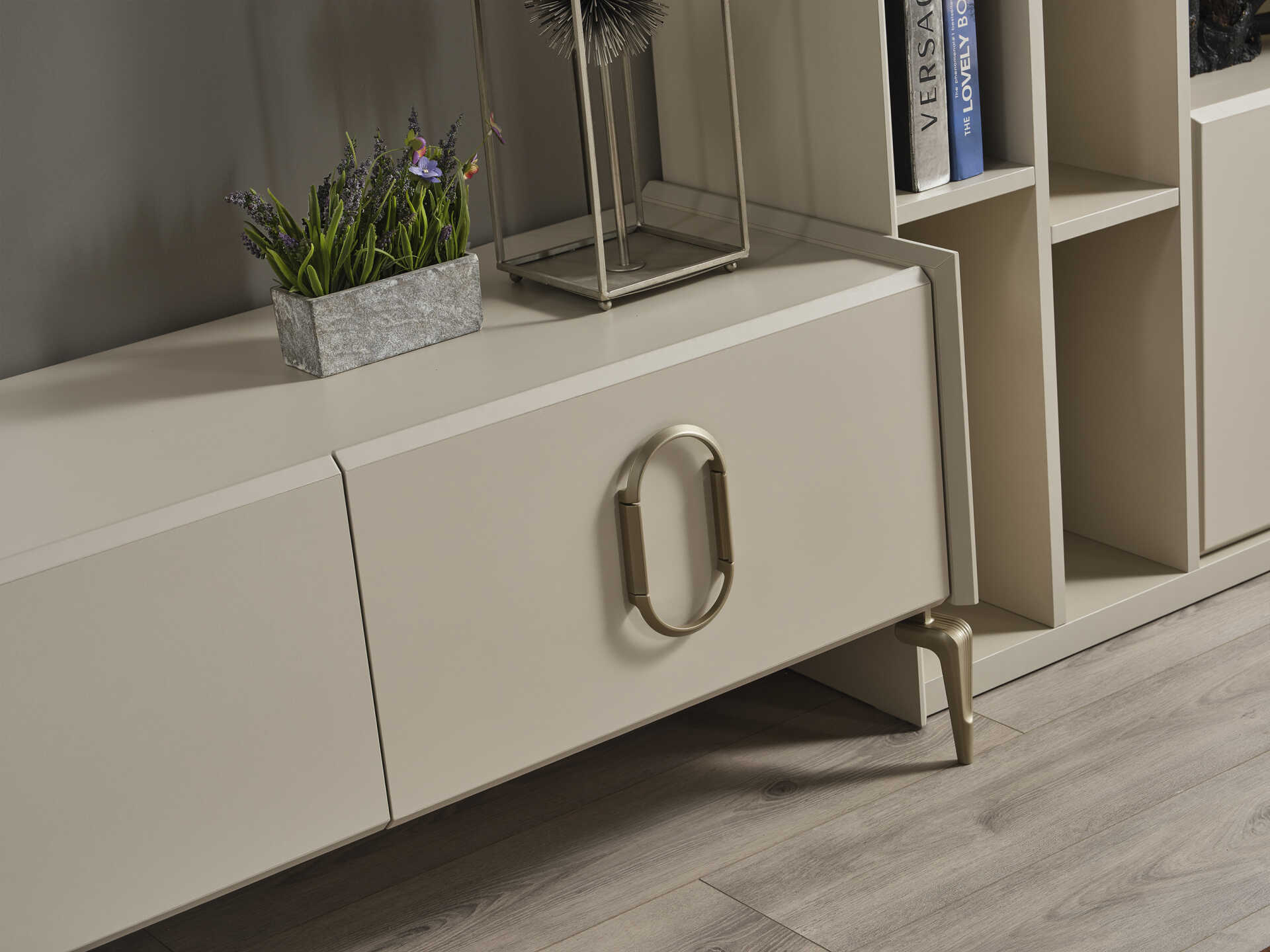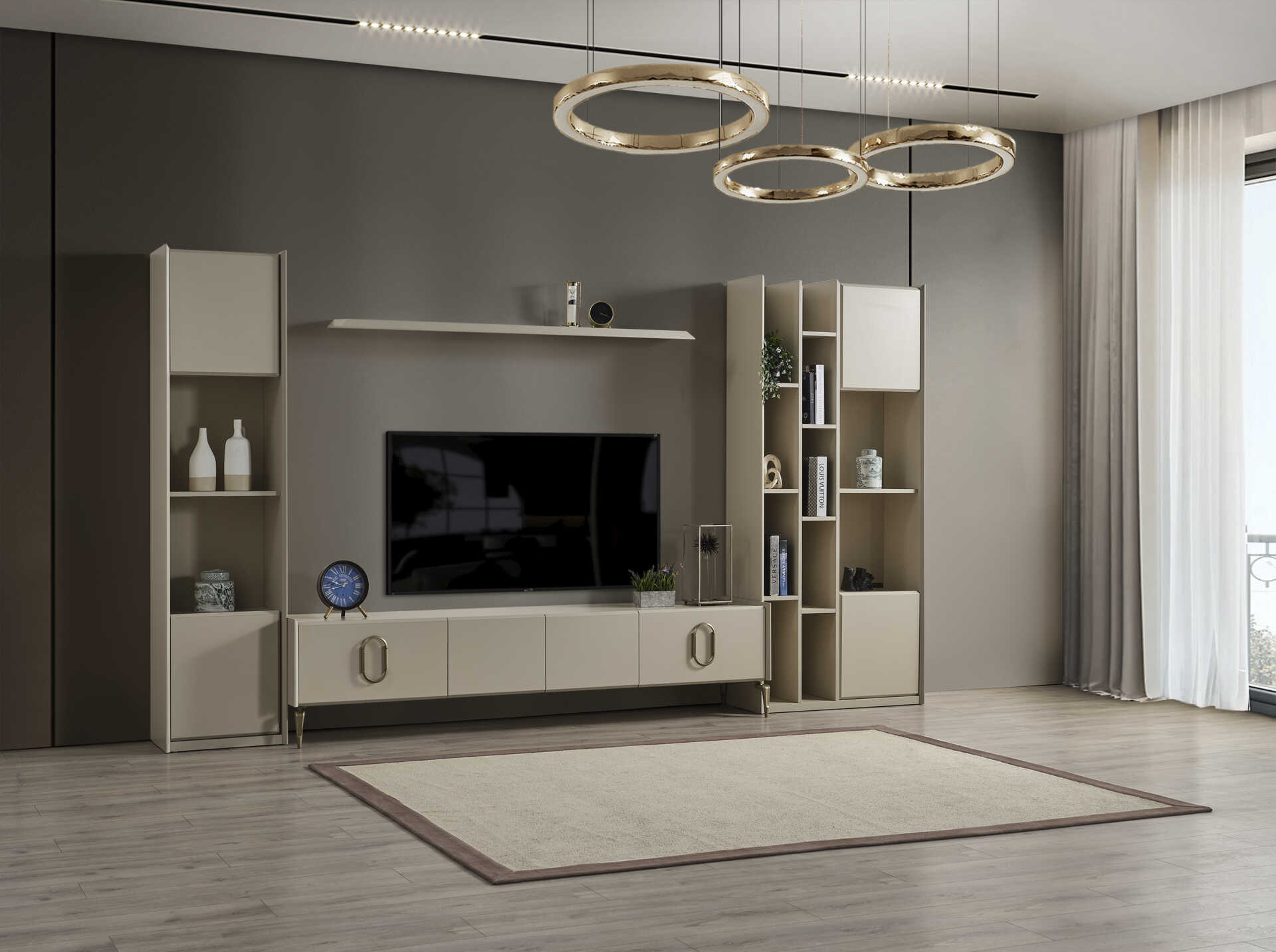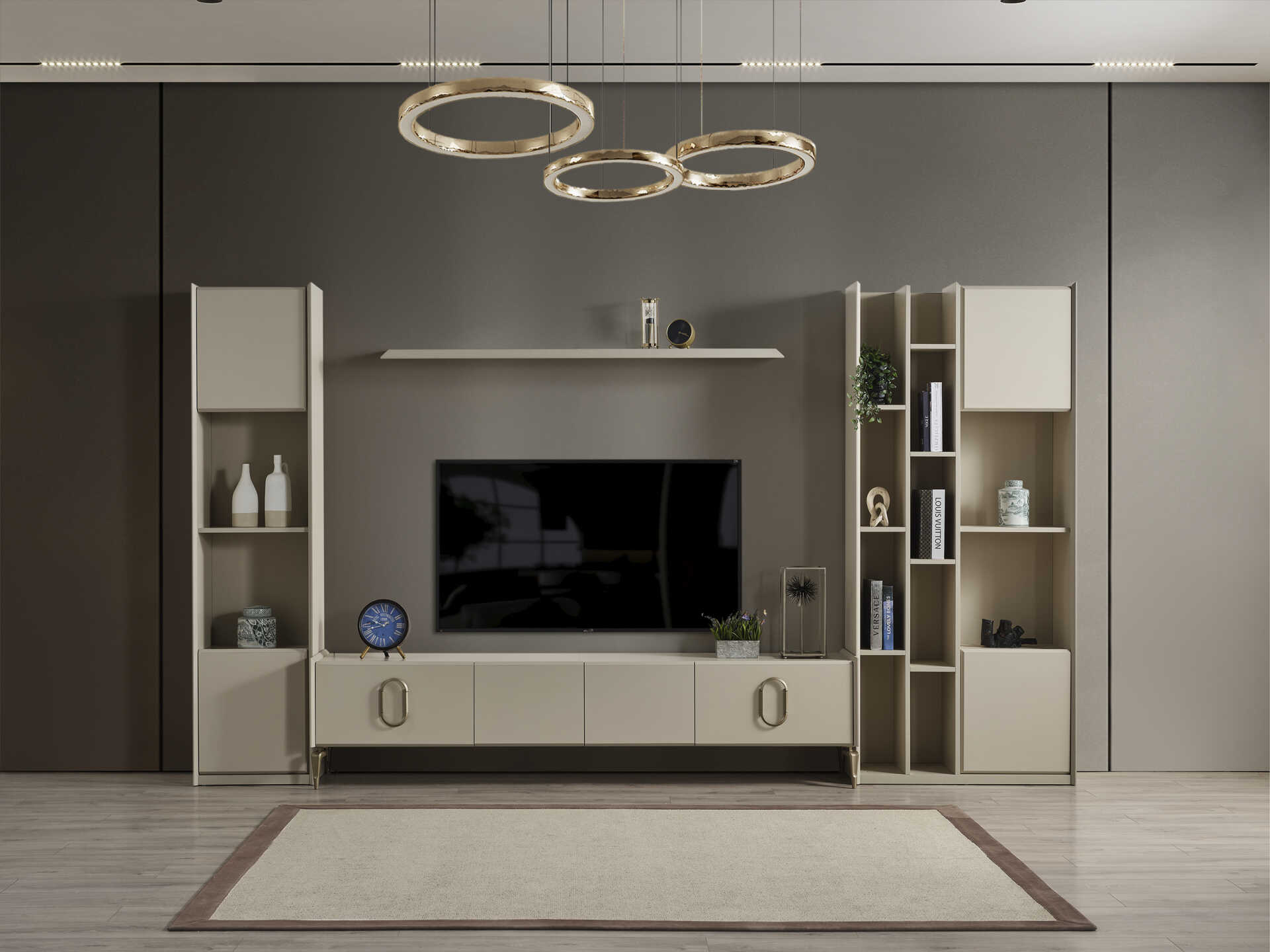 Monaco TV Ünitesi; altın detaylarla zenginleştirilmiş alt ve üst modülleri ile kitaplık bloklarıyla yaşam alanlarınıza modern bir düzen ve zarafet kazandırır