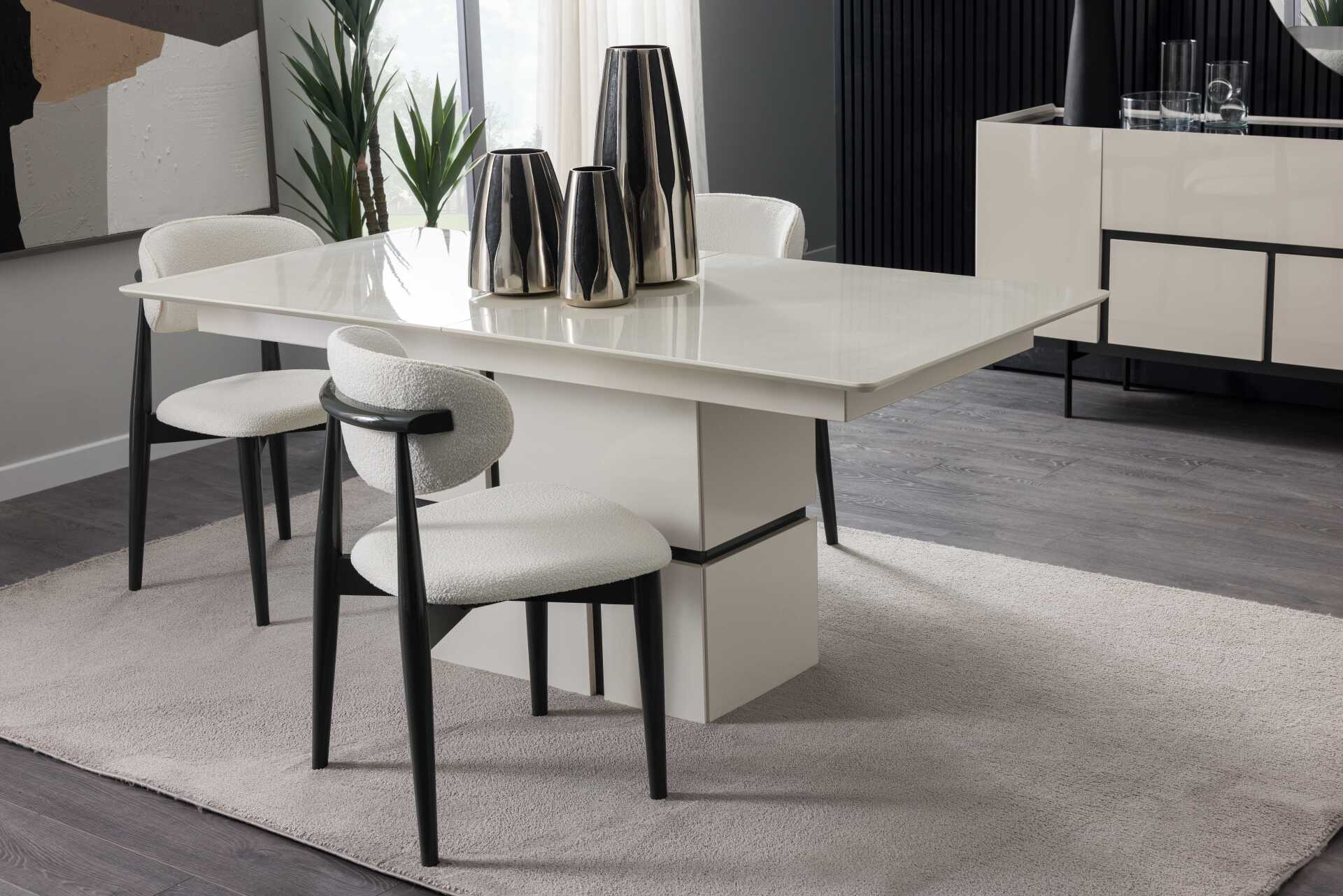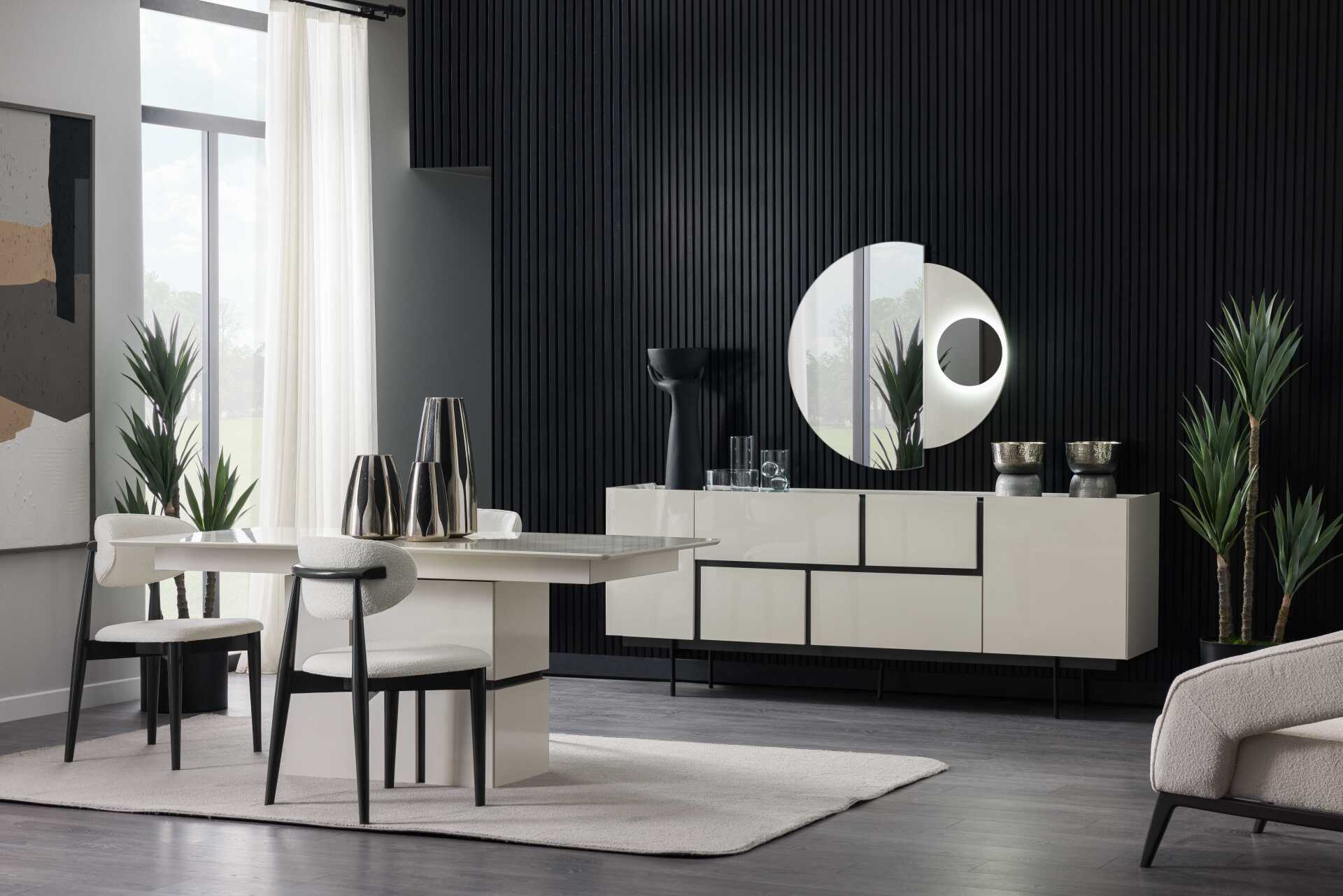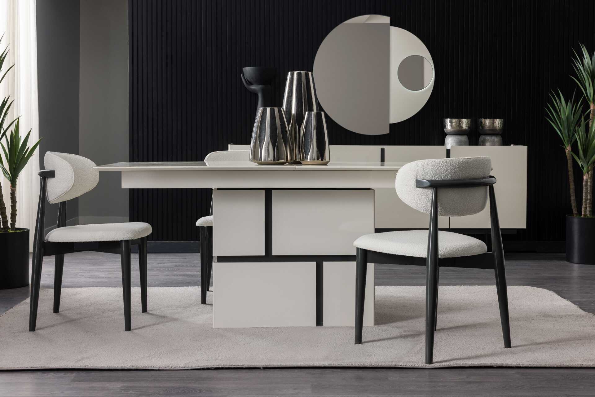 Pablo Yemek Odası Takımı, modern tasarımı ve sofistike detaylarıyla yemek odanıza zarif bir atmosfer kazandırıyor. Minimalist çizgilerle şekillenen masa ve konsol, siyah-beyaz kontrastıyla öne çıkan estetik bir duruş sergiliyor. Geniş konsol, yemek takımlarınızı düzenli bir şekilde saklamanıza olanak tanırken, açılabilir masa mekanınıza esneklik sunuyor. Yuvarlak formdaki dekoratif ayna ise mekâna derinlik ve ferahlık katarak şıklığı tamamlıyor. Pablo Yemek Odası Takımı, hem fonksiyonel hem de görsel açıdan fark yaratmak isteyenler için ideal bir seçimdir.