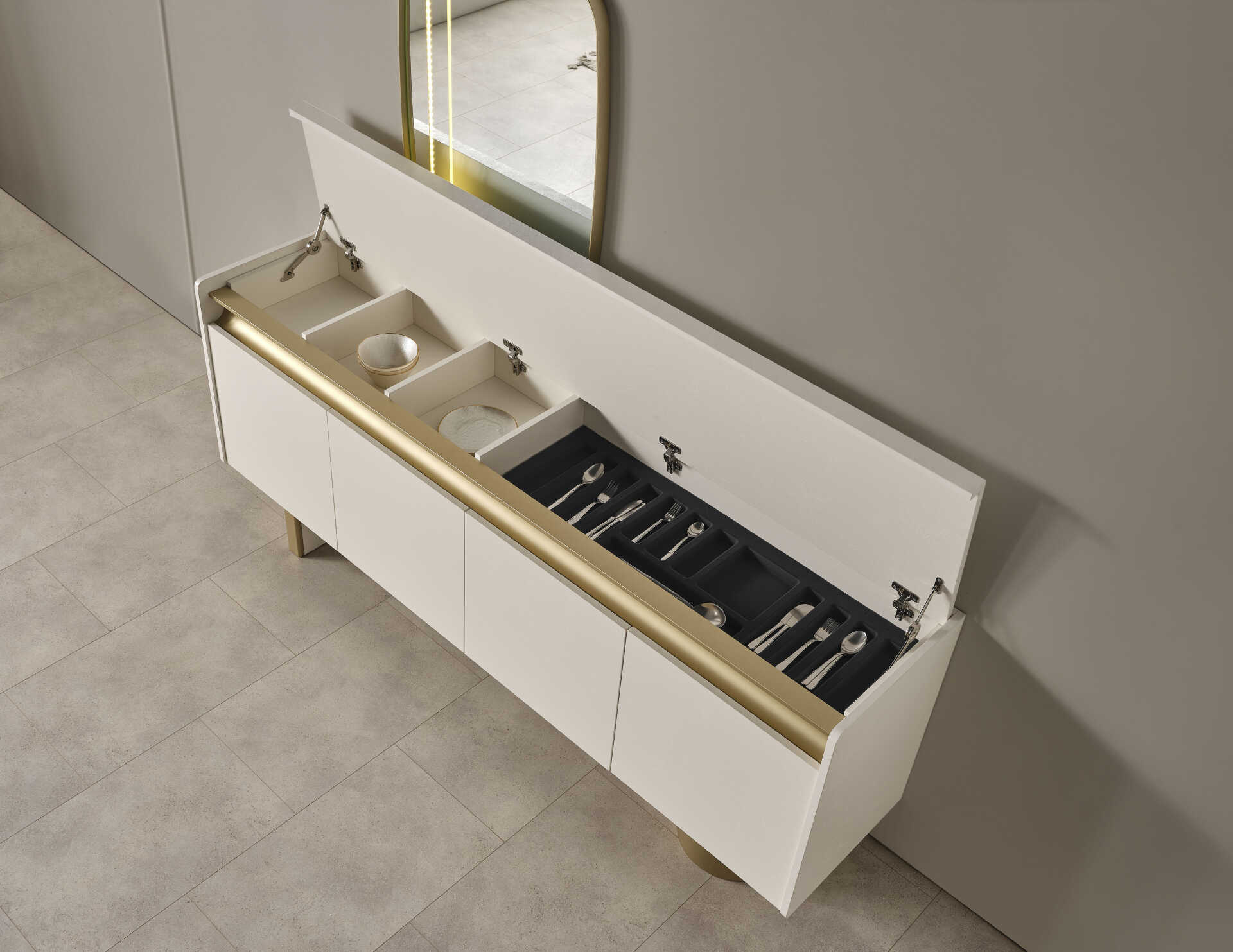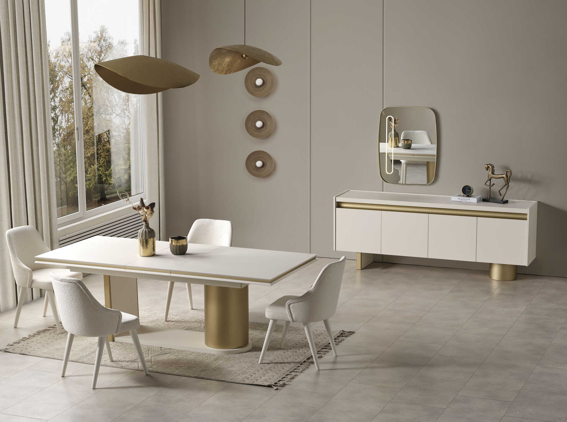Rio Delux Yemek Odası Takımı; altın detaylarla zenginleştirilmiş masası, ergonomik sandalyeleri ve geniş depolama alanı sunan konsolu ile yemek odanıza zarif bir atmosfer kazandırır