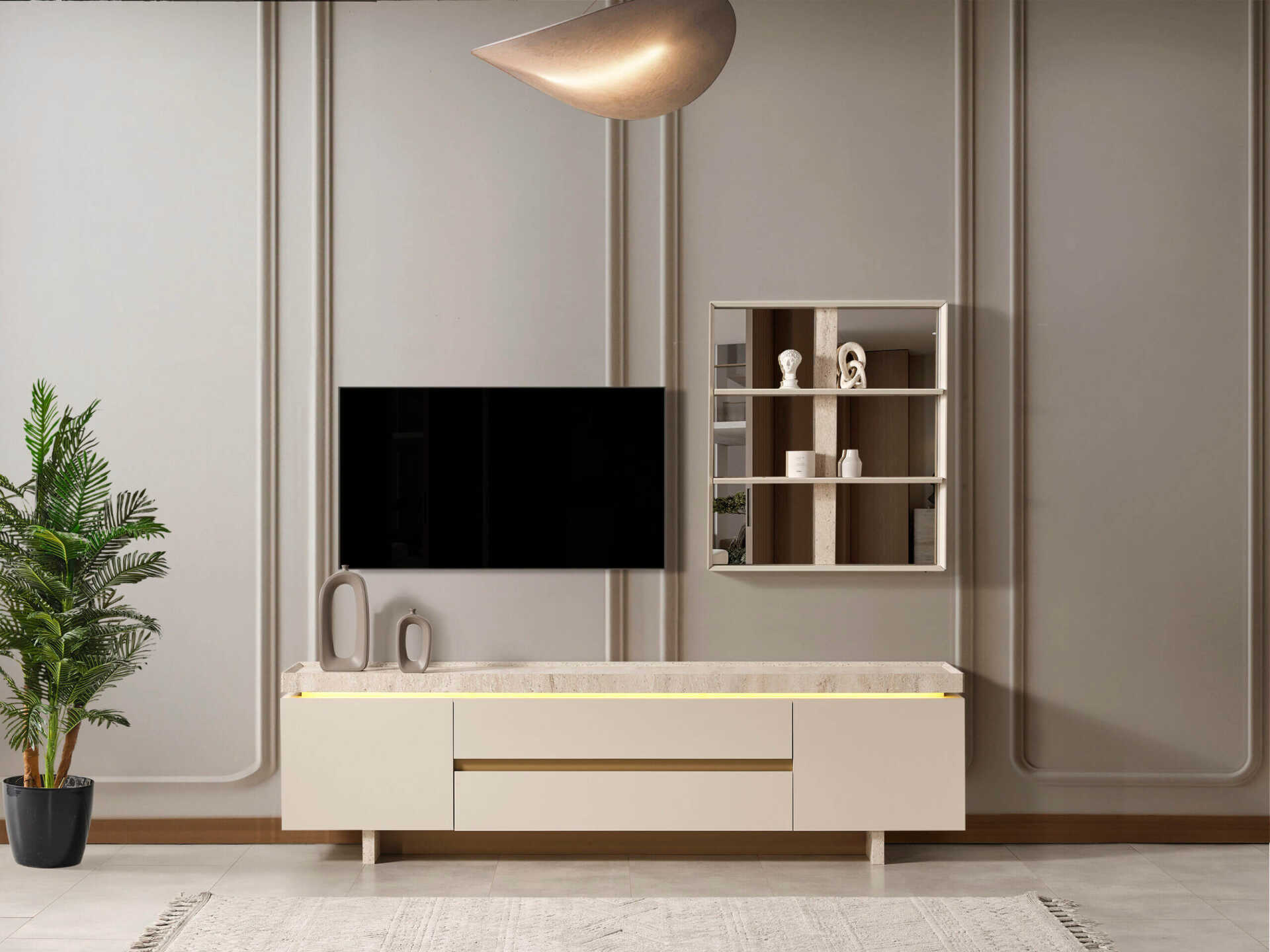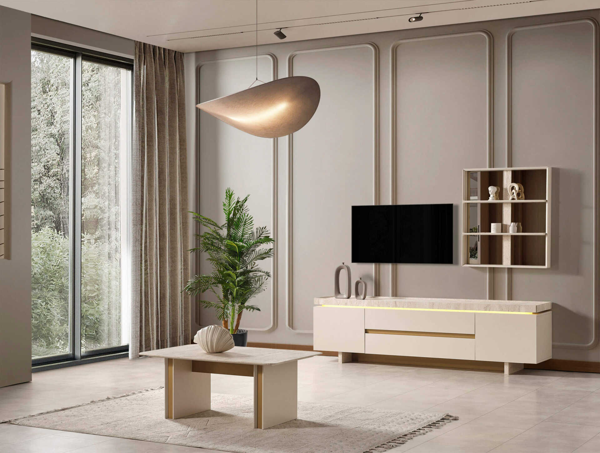 Robin TV Ünitesi, estetik ve işlevselliği bir arada arayanlar için mükemmel bir seçimdir. Hem televizyonunuz için şık bir stant oluşturur hem de salonunuzdaki dağınıklığı ortadan kaldırarak ferah bir atmosfer yaratır.