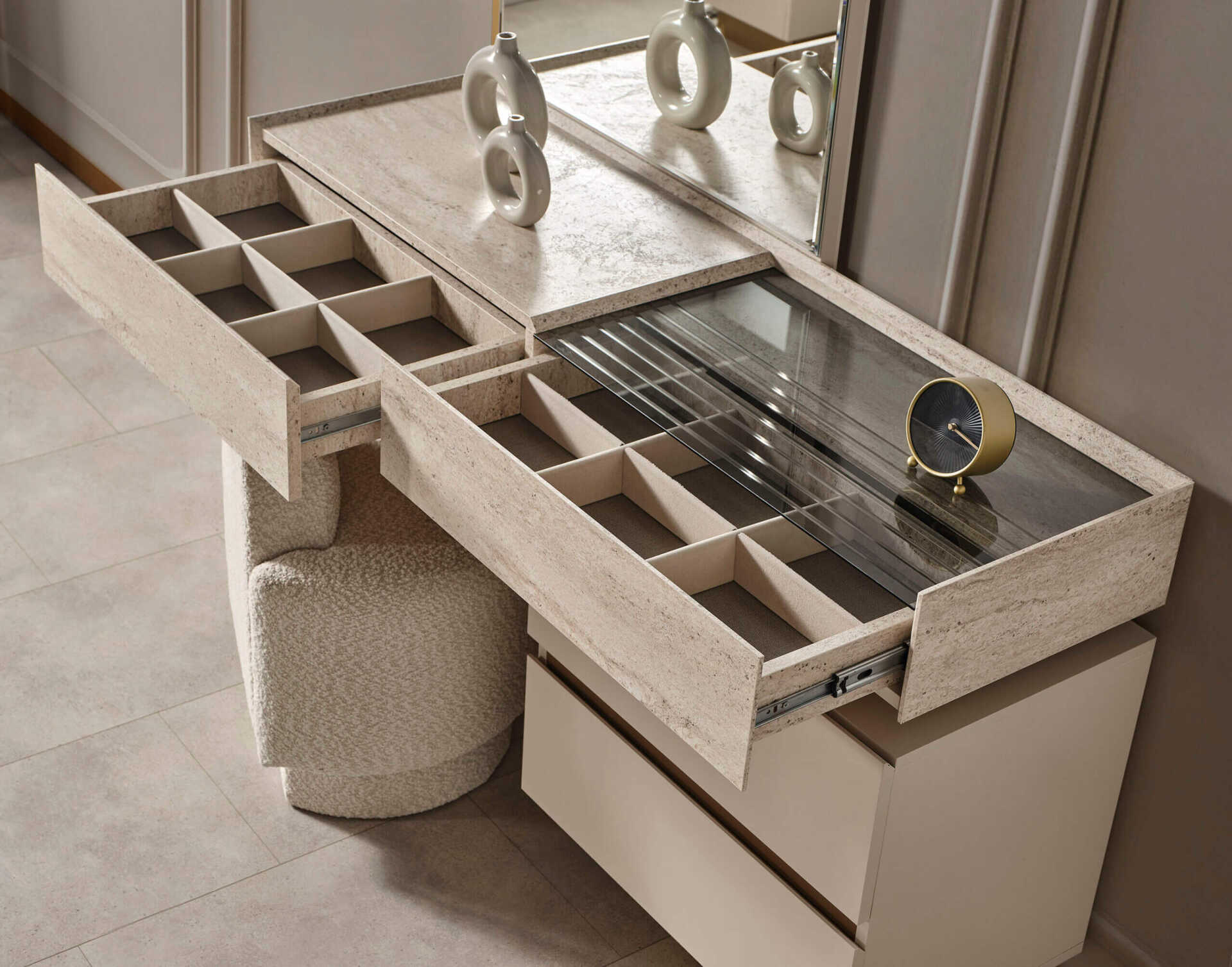 Üretici açıklamasında da belirtildiği gibi, Robin koleksiyonu estetik olduğu kadar fonksiyonelliğiyle de öne çıkar. "Kullanışlı depolama alanları" sunan takımın en dikkat çekici parçası, sürgülü kapaklı gardırobudur. Gardırop kapaklarındaki dikey fitilli (çizgili) desenler, tasarıma modern bir ritim katarken, geniş iç hacmi tüm eşyalarınız için ideal bir düzenleme alanı sağlar. Şık görünümü ve sıcak dokunuşlarıyla Robin, modern yaşam tarzını benimseyenler için ideal bir seçimdir.