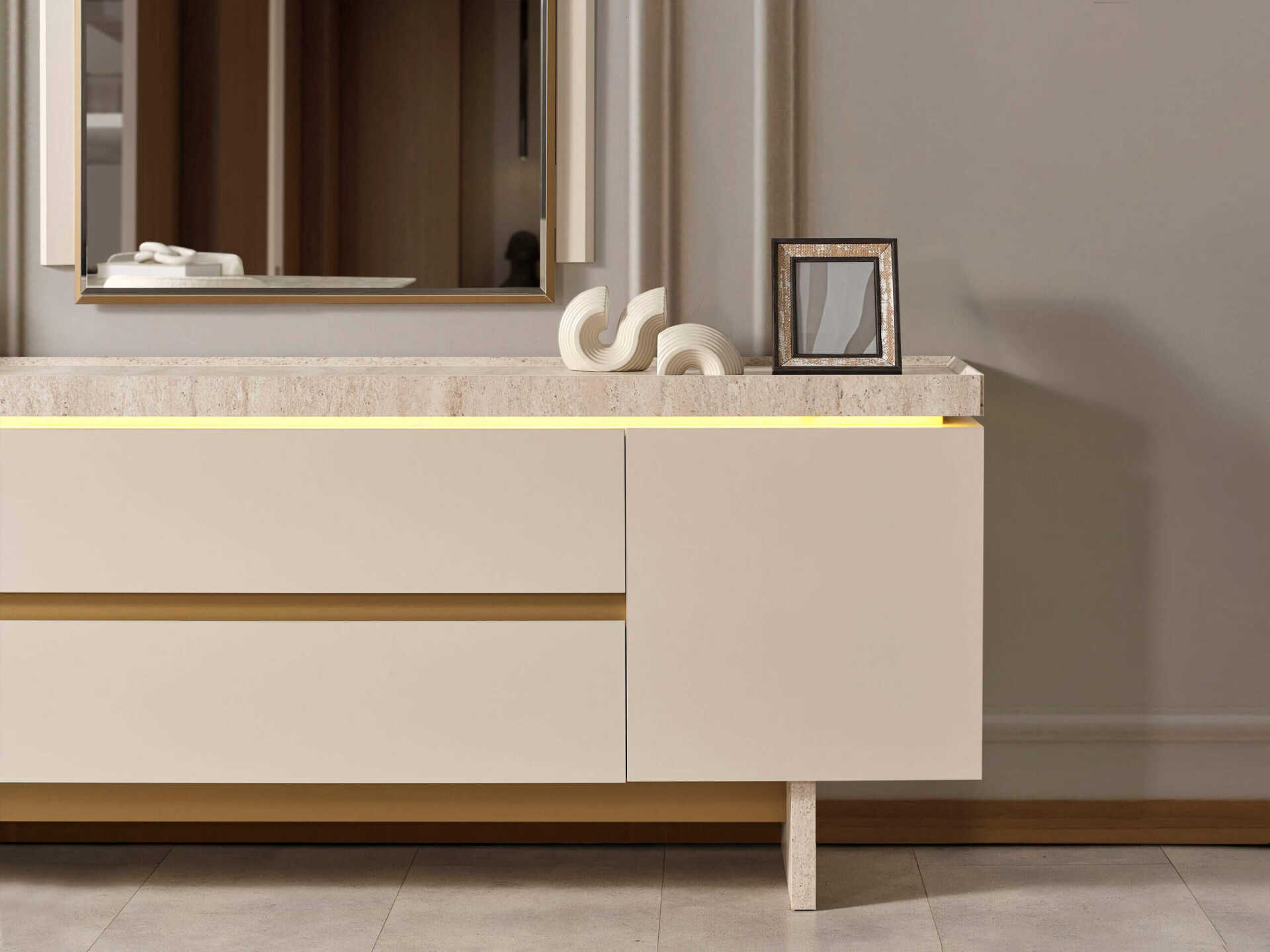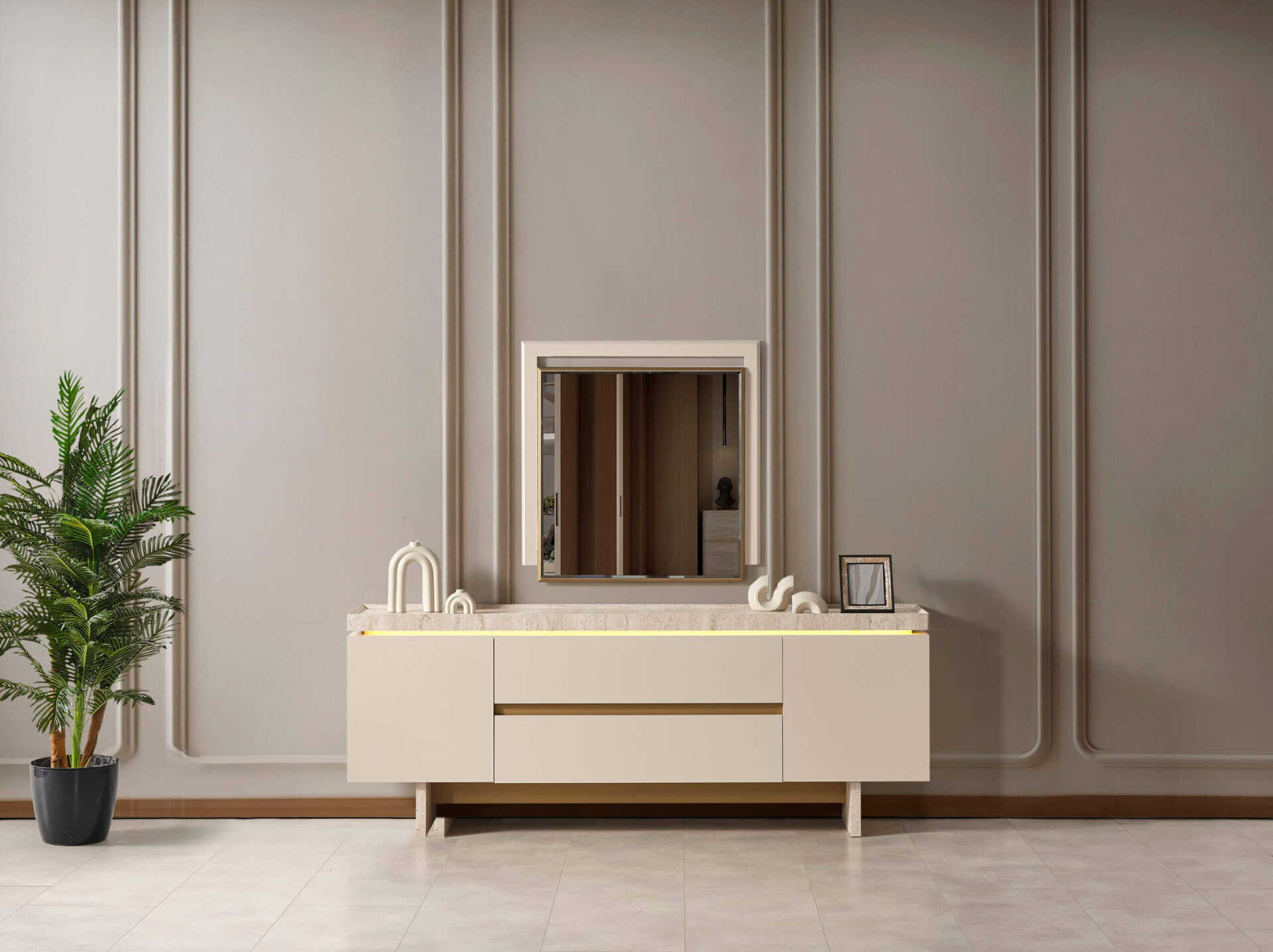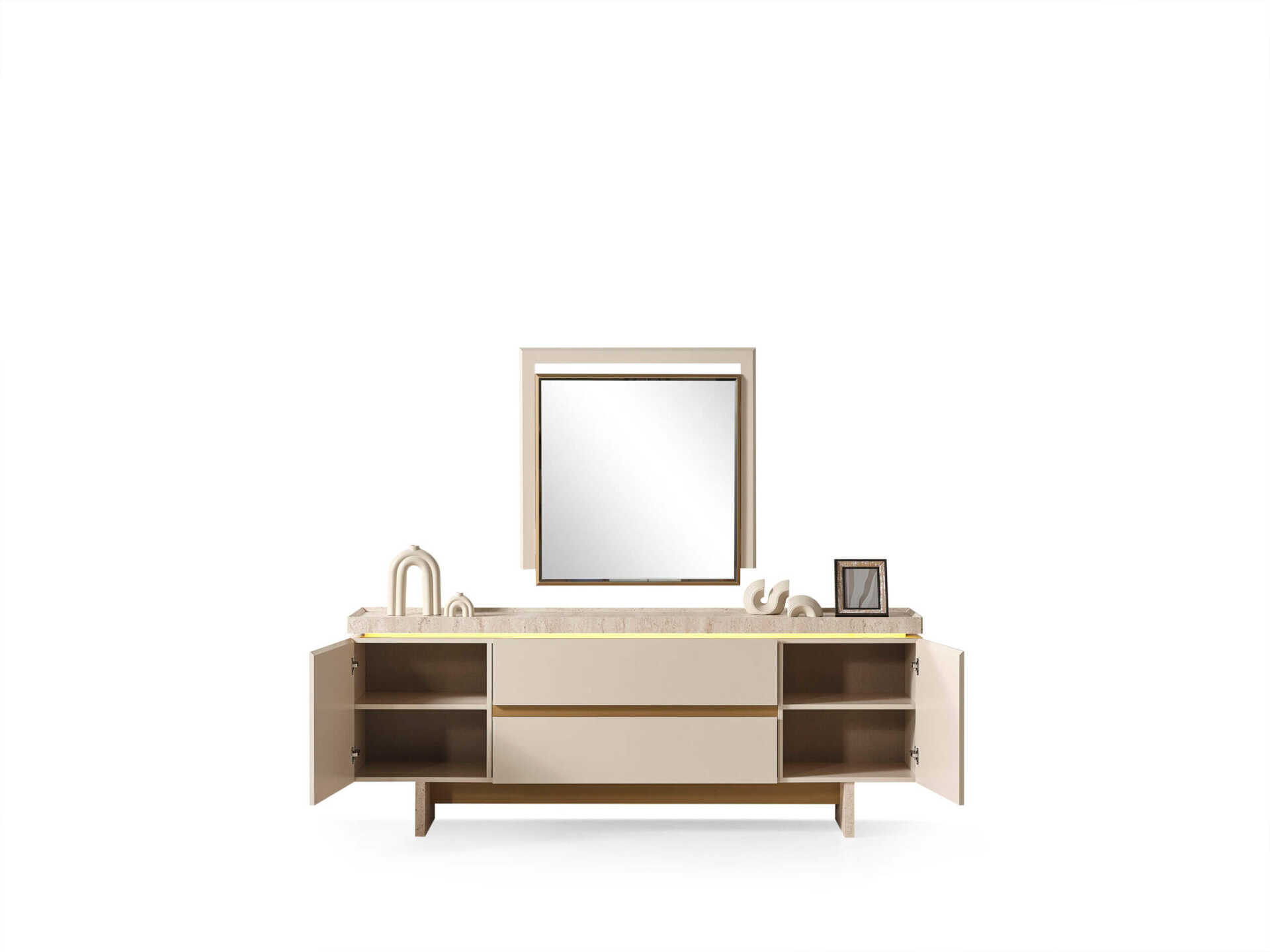 Takımın ana malzemesi olan ceviz renginin sıcak dokusu, tasarıma zarafet katan ince metal detaylarla kusursuz bir uyum içindedir. Geniş ve kullanışlı konsolu, yemek takımlarınızı ve aksesuarlarınızı düzenli bir şekilde saklamanız için bolca alan sunarken, ergonomik sandalyeleri uzun ve keyifli sohbetler için maksimum konfor sağlar.